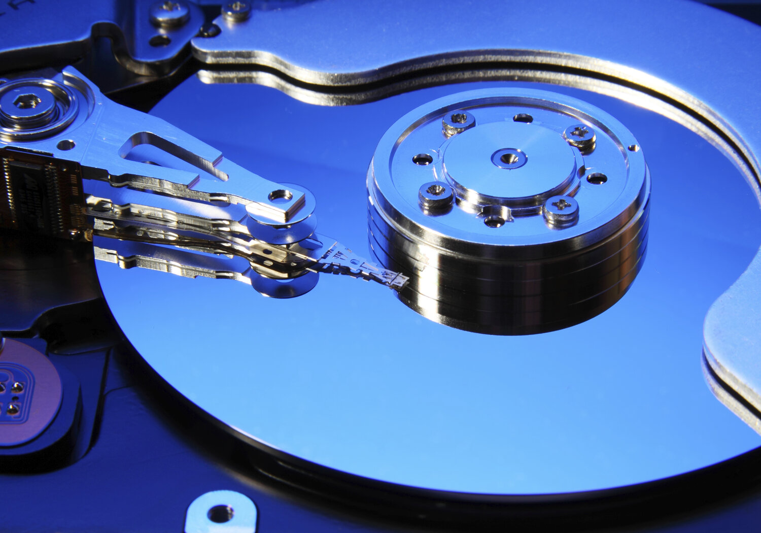 Close-up view of the opened hard disk drive
